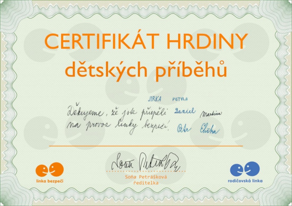 Jsme hrdí, že se naše společnost zapojila do podpory Linky bezpečí a získala Certifikát hrdiny dětských příběhů.