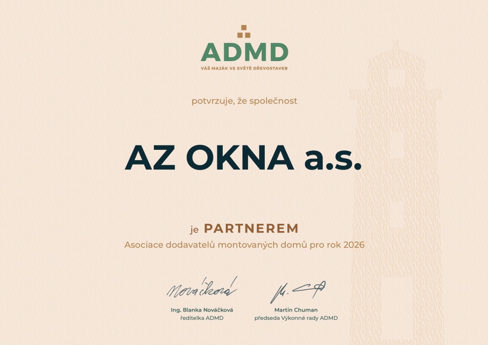 Partnerství s ADMD vnímáme jako potvrzení důvěry a odborného směřování, kterému se v AZ OKNA dlouhodobě věnujeme. Více informací o Asociaci dodavatelů montovaných domů najdete na webu: www.admd.cz
