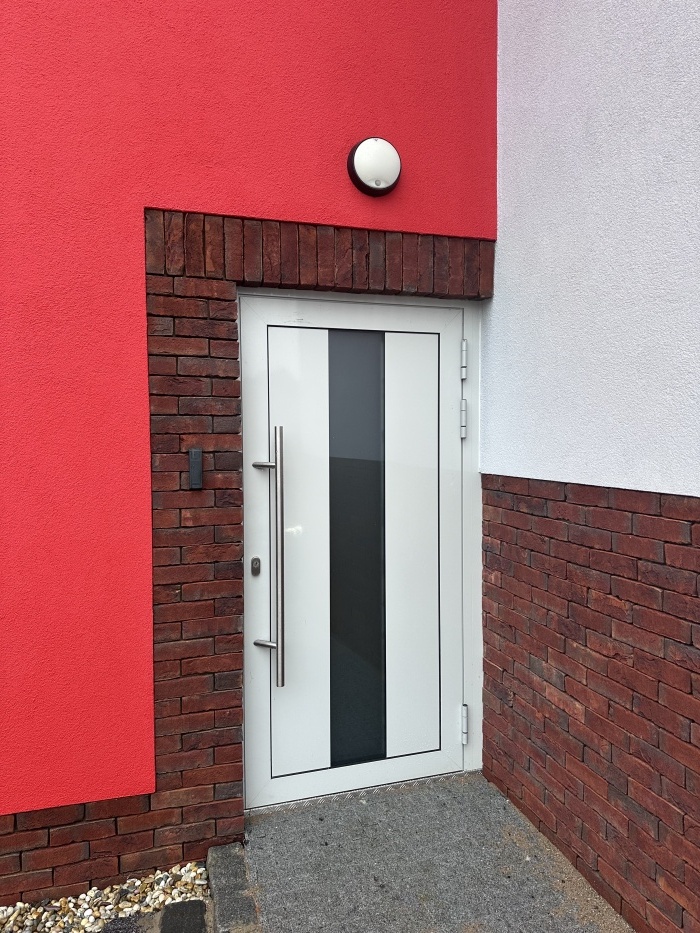 Hlavní vstup do zbrojnice jsme vybavili hliníkovými dveřmi Cortizo, které kombinují odolnost, stabilitu a moderní vzhled. Světlý odstín RAL 7035 skvěle ladí s okny a doplňuje jednotný design budovy. Dveře jsou navrženy tak, aby odolaly častému používání a zároveň poskytovaly bezpečný vstup.